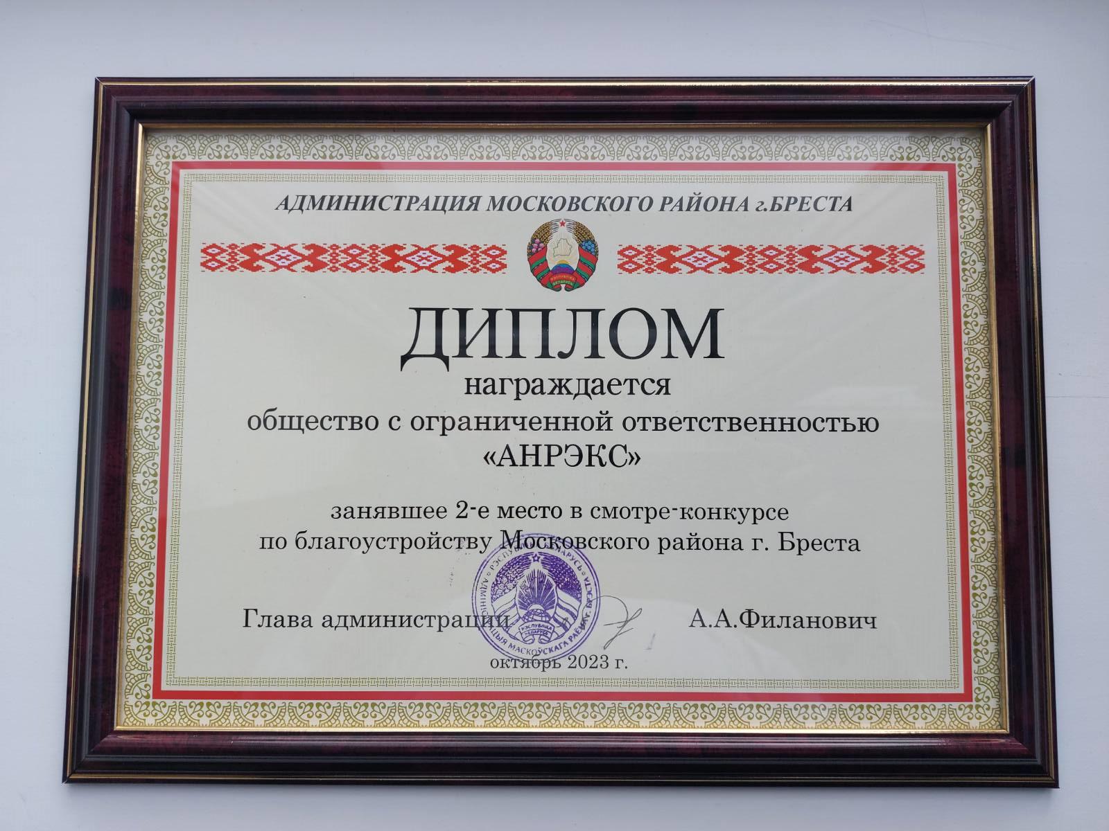 «Мой адрес – Московский район». Под таким названием 21 октября на площадке ТРЦ «Экватор» прошел праздник Московского района нашего города. В рамках программы состоялось подведение итогов смотра-конкурса района по комплексному благоустройству территорий и награждение победителей. Среди лучших – резидент СЭЗ «Брест» ИООО «АНРЭКС». В торжественной обстановке представителю предприятия вручен диплом администрации Московского района г. Бреста.
