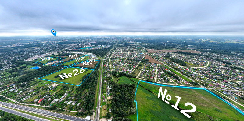 Теперь можно увидеть не только общую панораму района расположения земельных участков, но и оценить их нахождение относительно друг друга, прилегающих территорий и инфраструктурных объектов. Каждый участок пронумерован и снабжен дополнительной информацией о его площади. Для детального изучения каждого участка доступен его круговой обзор и возможность приближать изображение.
