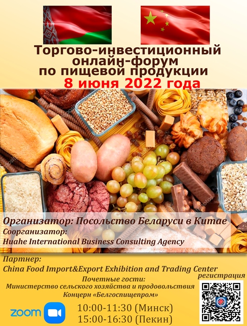 8 июня Посольство Республики Беларусь в КНР совместно с профильными ведомствами двух стран проводит Торгово-инвестиционный онлайн-форум по пищевой продукции.