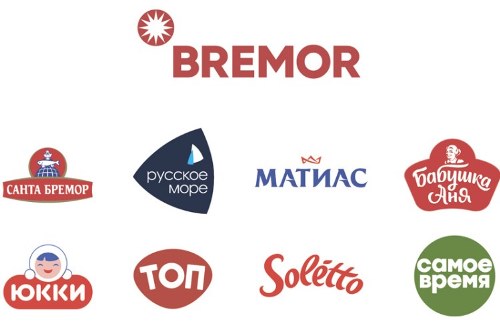 Теперь у компании единый корпоративный бренд – BREMOR. Он объединил всё, чем занимается компания, – от производства продуктов питания до экологических проектов и социальных инициатив. Широко известный бренд «Санта Бремор» остается только для обозначения выпускаемых предприятием продуктов питания, наряду с популярными марками «Матиас», «Русское море», «Бабушка Аня», «Самое время», «ЮККИ», «ТОП» и Soletto.