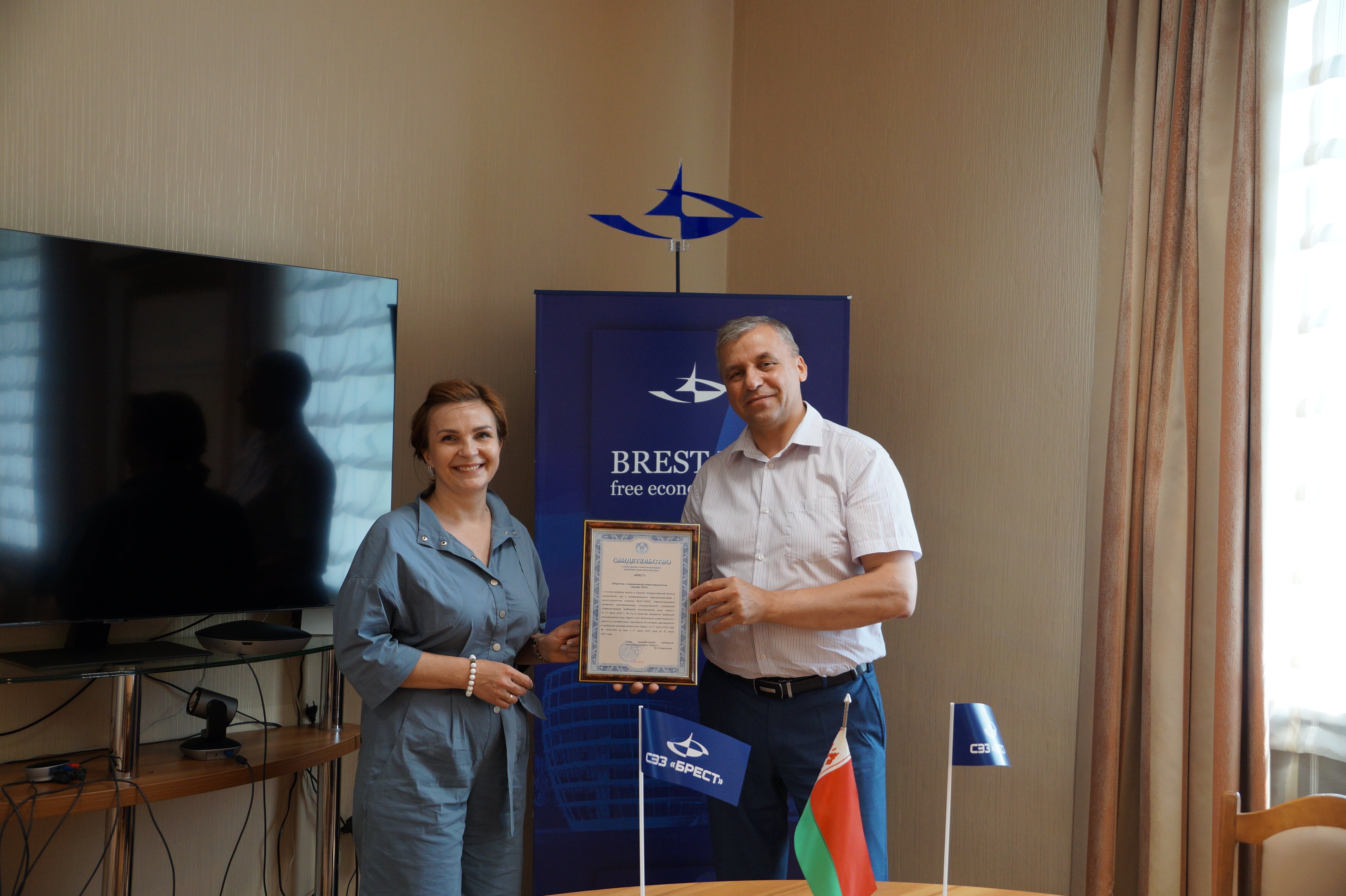 Глава администрации СЭЗ «Брест» Михаил Николаевич Самолазов торжественно вручил свидетельство о регистрации директору предприятия Елене Владимировне Костюкович и пожелал успешной реализации проекта.